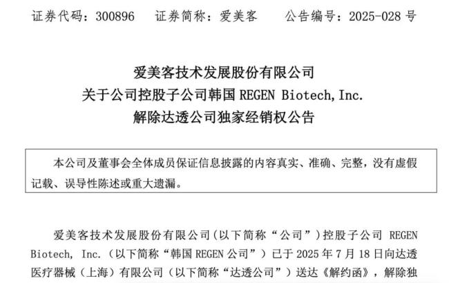7月21日,爱美客与江苏吴中【*ST苏吴(600200.SZ)】齐发公告,爱美客的控股子公司韩国REGEN公司已于2025年7月18日向达透公司送达解约函,解除独家经销协议,并撤销达透公司作为艾塑菲(AestheFill)产品在中国大陆地区独家经销商所有相关授权。
