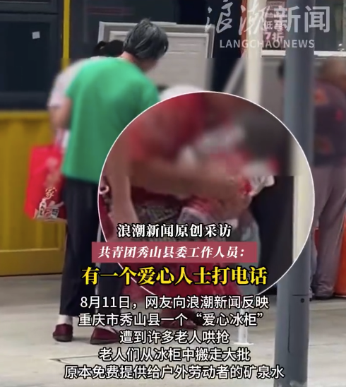 8月11日,网友向记者反映,重庆市秀山县一个“爱心冰柜”遭到哄抢。有人从冰柜中搬走大批原本免费提供给户外劳动者的矿泉水。视频显示,大约10多人围着爱心冰柜扎堆哄抢,他们用胳膊夹着、怀里抱着,一位老人一次性就抱走8瓶水。