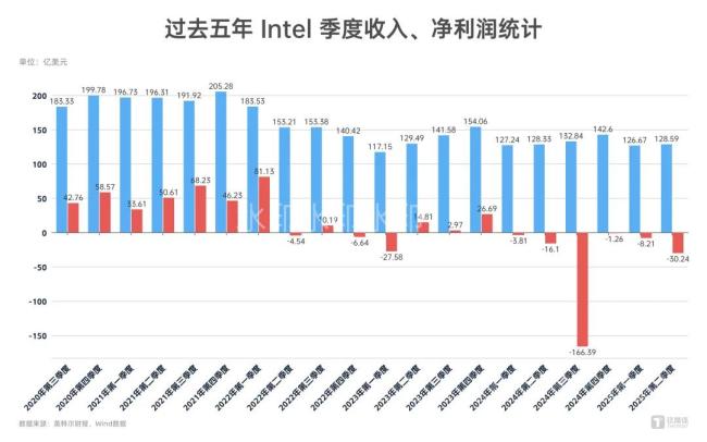财报显示,二季度英特尔营收为129亿美元,同比持平;经调整后归属股东净亏损为4亿美元,较上年同期的净利润1亿美元转亏。二季度经调整归属股东每股净利润为净亏损0.1美元,不及市场预期的每股盈利0.01美元。