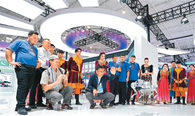 在交易会上,观众与机器狗互动。