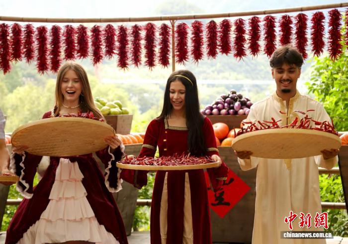 正在体验“晒秋”文化的外国友人。熊锦阳 摄