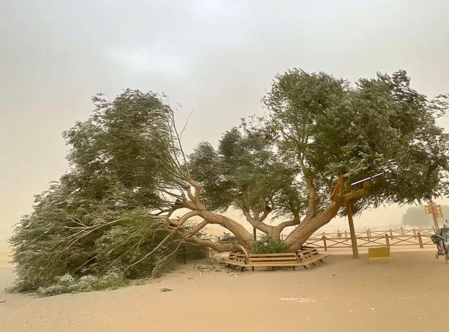 8月19日下午,甘肃敦煌突遇沙尘天气,鸣沙山月牙泉景区内一对种植了54年的“夫妻柳”被吹断。不少游客拍下了当时的画面,并戏称这对柳树“离婚”了。