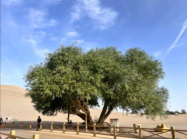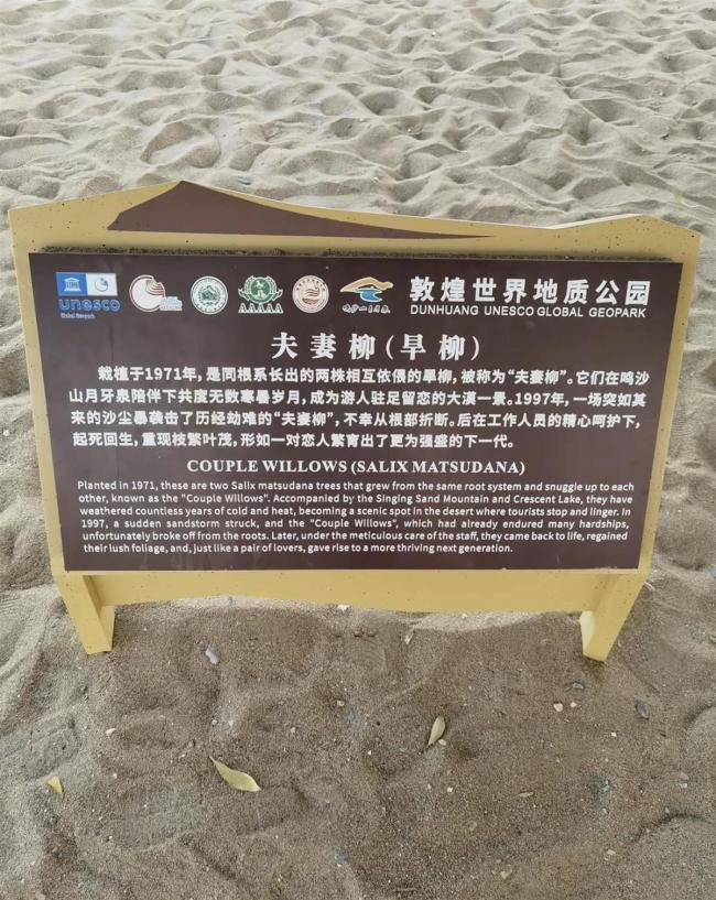 鸣沙山月牙泉风景名胜区位于敦煌城南五公里处,以其独特的沙泉共存景观闻名。由于地处沙漠戈壁,该地区不时会遭遇沙尘天气。1997年,“夫妻柳”曾因一场突如其来的沙尘暴从根部折断,但在工作人员的精心照料下恢复生机,繁育出了更为强盛的后代。这段故事也被写进了“夫妻柳”的简介中,吸引了不少游客驻足观看和拍照。