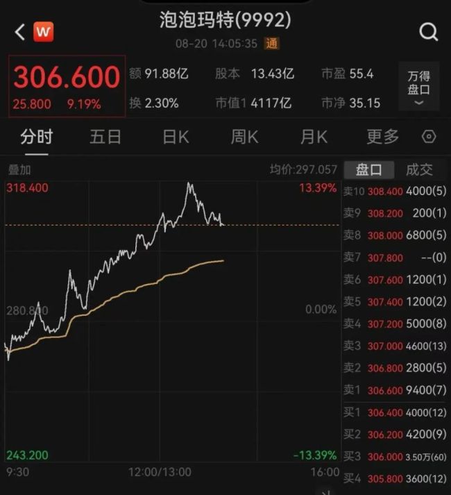 盘面上,泡泡玛特股价一度涨超13%,创下历史新高,总市值突破4000亿港元。截至发稿,股价涨幅回落至9.19%,报306.6港元,市值为4117亿港元。