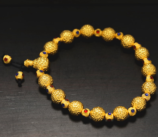 若说东方符号是金饰的“魂”,那非遗工艺便是它的“骨”,珂霖金铺对非遗工艺的坚守,藏在每一道纹路里。捶揲纹工艺在捶揲纹手串中重现光彩,工匠以千次捶打造就的凹凸肌理,让黄金保留古色古香的同时,又因红蓝珐琅隔珠的点缀,多了几分年轻活力,这正是古法工艺守正创新的生动诠释。
