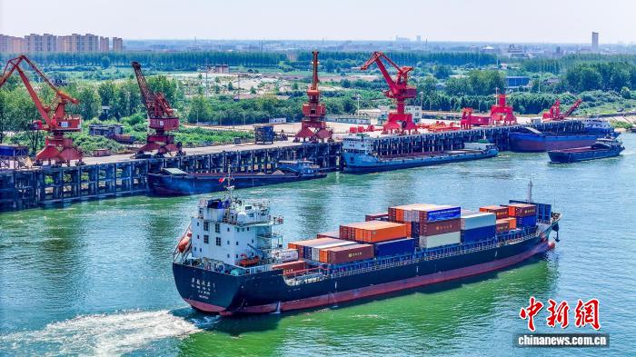 图为荆州港盐卡港区直航日韩国际航线首航。(无人机图片)张梦瑶 摄