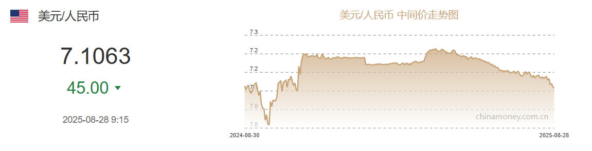 8月28日人民币对美元中间价报7.1063元 上调45个基点