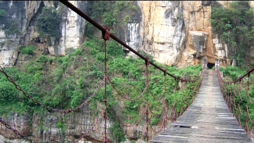花江铁索桥始建于1898年,横跨关岭与贞丰交界的北盘江段,由14根铁链组成,桥长70余米,宽3米。