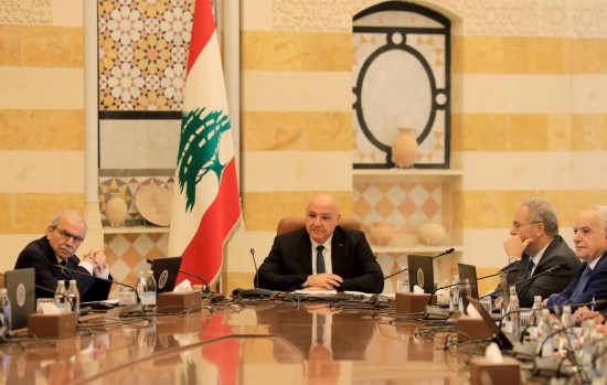 8月5日,黎巴嫩总统约瑟夫·奥恩(左二)和总理纳瓦夫·萨拉姆(左一)在贝鲁特的总统府巴卜达宫出席内阁会议。新华社发(比拉尔·贾维希摄)
