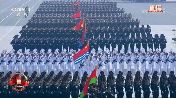 而当来自各军兵种、身着不同颜色军服的一个个徒步方队,正步通过天安门时,那整齐划一的步伐,雄浑嘹亮的口号,再加上虎虎生威的劈枪动作,更可充分展现中国军队纪律严明、士气高昂、一往无前的气势与力量。