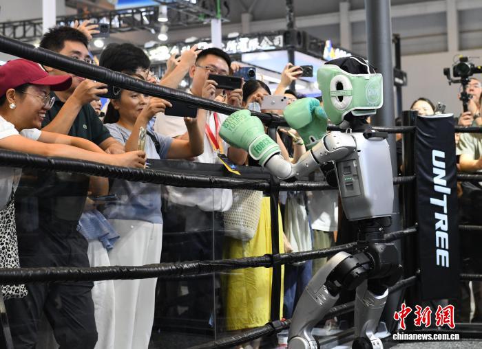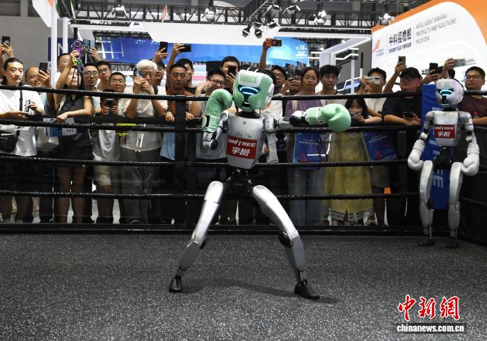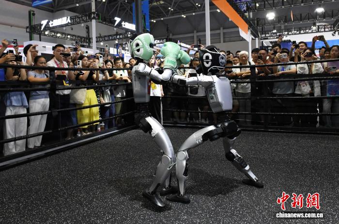 9月5日,2025世界智能产业博览会在重庆开幕。活动现场,宇树科技携人形机器人举行了一场拳击比赛,吸引民众围观。图为机器人在比赛前与观众互动。中新社记者 周毅 摄