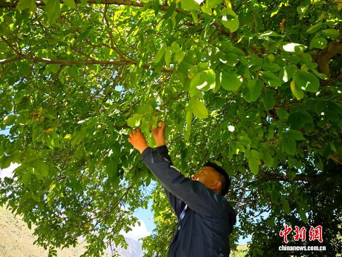 图为树主泽仁扎西采摘果实。中新社记者 张浪 摄