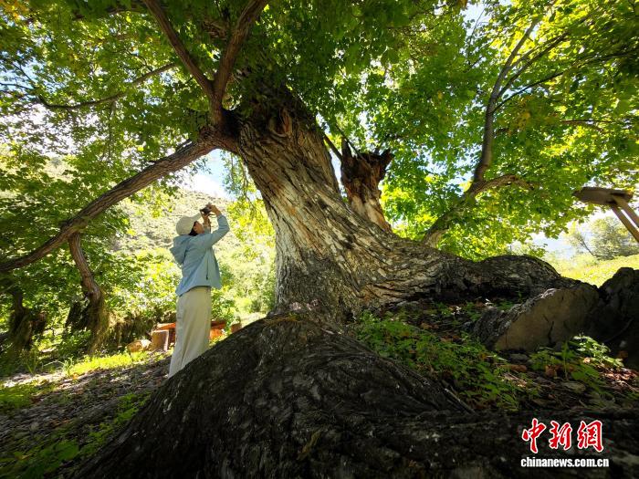 图为千年“胡桃王”吸引游客拍摄。中新社记者 张浪 摄