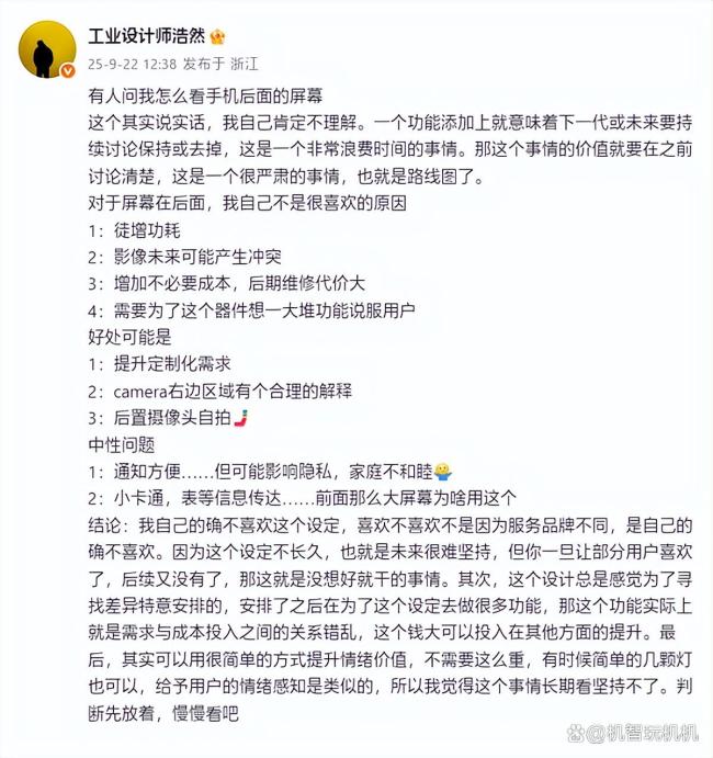 早在小米17系列发布前,OPPO工业设计中心总经理刘浩然就表示不喜欢副屏设计,认为它不可持续。他认为,一旦用户喜欢了这个设计,后续又取消,会导致用户体验不佳。虽然如此,目前小米17 Pro凭借副屏成功实现了差异化,提升了销量。未来如何发展,还需要看小米的处理方式。小米17Pro背屏做痛机爆火 二次元玩法引关注!