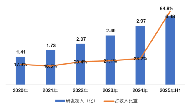 今年上半年,博瑞医药研发投入3.48亿,同比增长144.07%,绝对值已经超过2024年全年,投入强度差不多是上半年总收入的65%,超过90%投向创新药和吸入制剂。