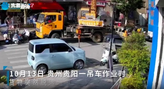 10月13日,贵州贵阳。观山湖区一施工吊车作业过程中发生意外,货物脱落砸中路人,有监控拍下事发瞬间,画面显示事故造成有人员受伤送医。