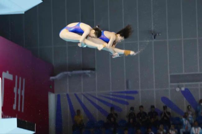 女子团体比赛包括一天内进行的单人、双人3米板比赛以及单人、双人10米台四项比赛,按各队总得分排名。双人10米台是女子团体的最后一项比赛。在此之前进行的女子团体单人3米板比赛中,全红婵还来到场边为参赛的队友陈艺文加油。