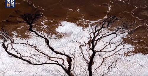 近日,内蒙古芒乃淖尔盐湖出现巨型“大地之树”景观。从空中俯瞰,树干与枝桠脉络分明,宛如大自然的写意画。