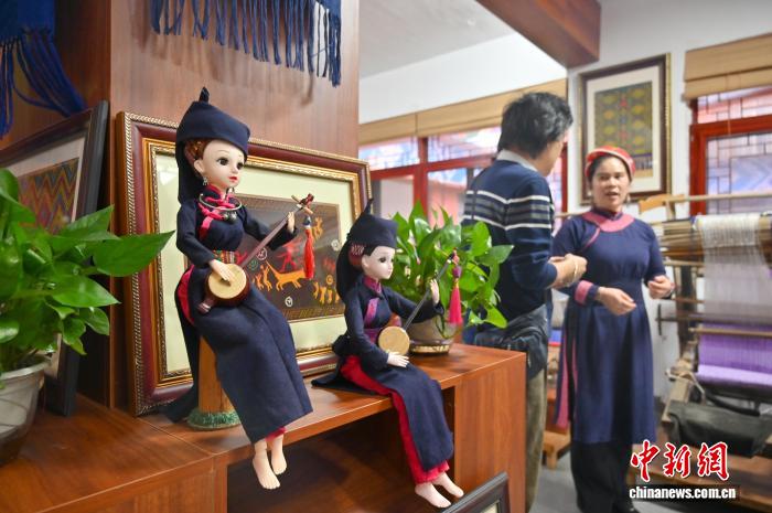 网络达人走进广西龙州感知壮锦非遗技艺图为壮族娃娃。俞靖 摄 图为李素英创作含有壮、瑶、苗民族元素的织锦作品。俞靖 摄