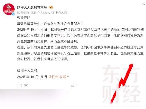 鸡柳大人官方致歉回复黄星黑称10月15日,@鸡柳大人总部官方号发布致歉声明,“尊敬的黄星先生、各位粉丝及社会各界朋友:2025年10月14日,我司账号在评论区针对某条涉及艺人黄星的负面称呼因内部审核疏漏及对网络用语的敏感度不足,误以为普通字面意思予以回复,未能识别该称...