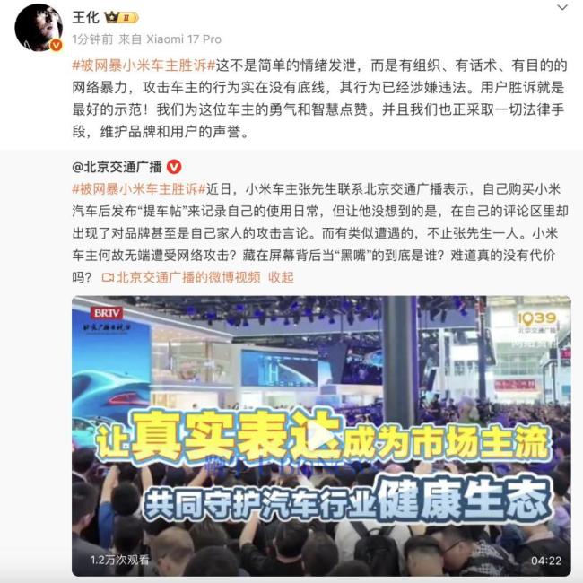 小米王化称攻击车主的行为没有底线 网络暴力需严惩9月23日,小米集团公关部总经理王化转发了一条关于小米车主胜诉的微博,并表示攻击车主的行为没有底线。他认为这不是简单的情绪发泄,而是有组织、有话术、有目的的网络暴力,这些行为已经涉嫌违法。王化强调,用户胜诉是最好的示范