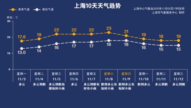 上海气温逐步回升 冷空气周末到 周后期雨水增多上海今天云系增多,以多云到阴为主,最低气温14℃,最高19℃,气温比昨日略有上升。建议注意补水润燥,并在早晚添衣保暖。本周气温逐渐回升,周末时最高气温将重回23℃左右