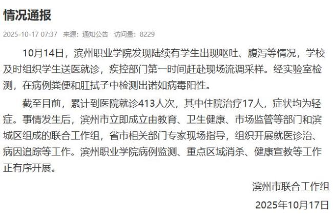 官方通报滨州多名学生呕吐腹泻 诺如病毒阳性确诊10月14日,滨州职业学院发现学生陆续出现呕吐、腹泻等症状。学校迅速组织学生就医,并联系疾控部门进行现场调查和采样。实验室检测结果显示,病例粪便和肛拭子中诺如病毒呈阳性