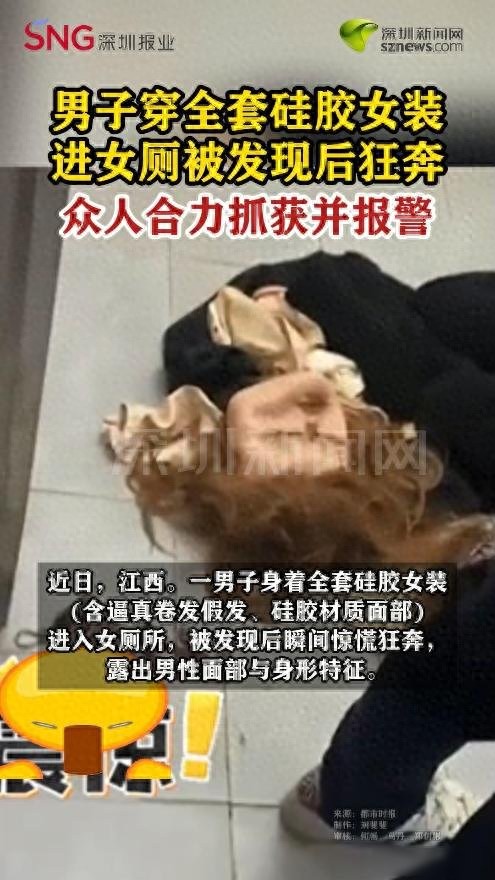 以假乱真!男子穿硅胶女装进女厕 伪装惊现女厕近日,在江西发生了一起男子伪装进入女厕所的事件。这名男子身穿全套硅胶女装,包括逼真的卷发假发和硅胶面部,试图混入女厕所。被发现后,他惊慌失措地逃跑,过程中露出男性面部和身形特征。现场的人们察觉到异常后迅速围堵,最终将其控制并报警